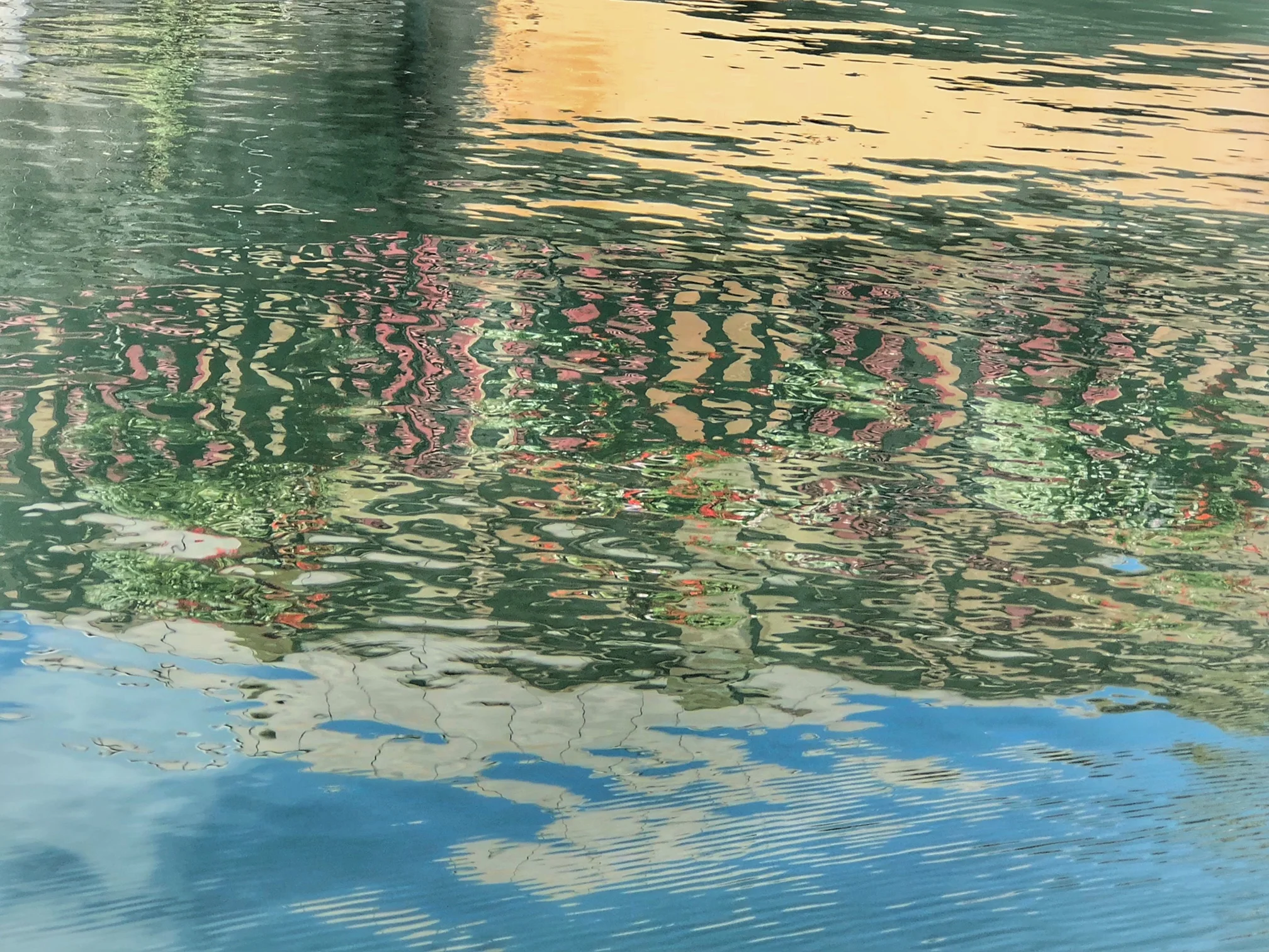 On the water's surface all edges of the slanted roofs, brightly painted wooden shutters and doors grew softer, more ethereal and for sure, abstract.. Colors took on a translucent quality in the fluidity of the ever-changing motion of the water. The angle of the light and the calmness of the water invited me to photograph. And, unlike capturing a more typical "hardscape", the image was never the same. The world became ethereal, alive.