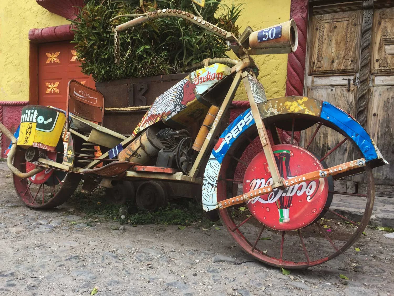 Returning a year later, I came across more inspiring painted walls each time I turned a corner. And then before me was another surprise: an oversized bicycle constructed of recycled metal Coke, Pepsi and Corona signs, a bike which will never be ridden. It remains attached by a few twisted ropes to a large potted plant on a sidewalk.