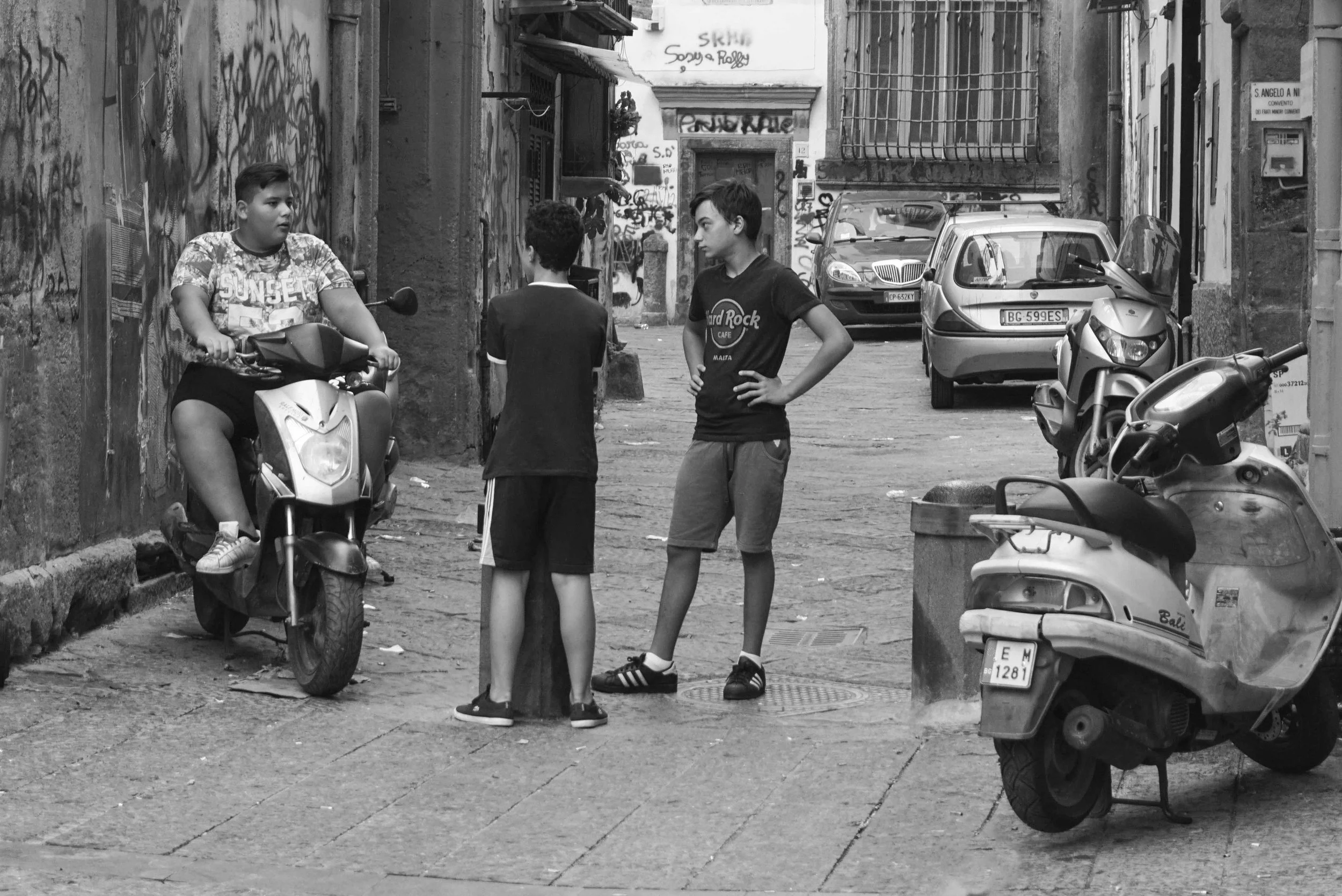 Beyond any formal lines there is the human landscape one encounters both in passing or around the corner from a station. Here in Naples young teenagers are hanging out or exploring their own means of transportation.