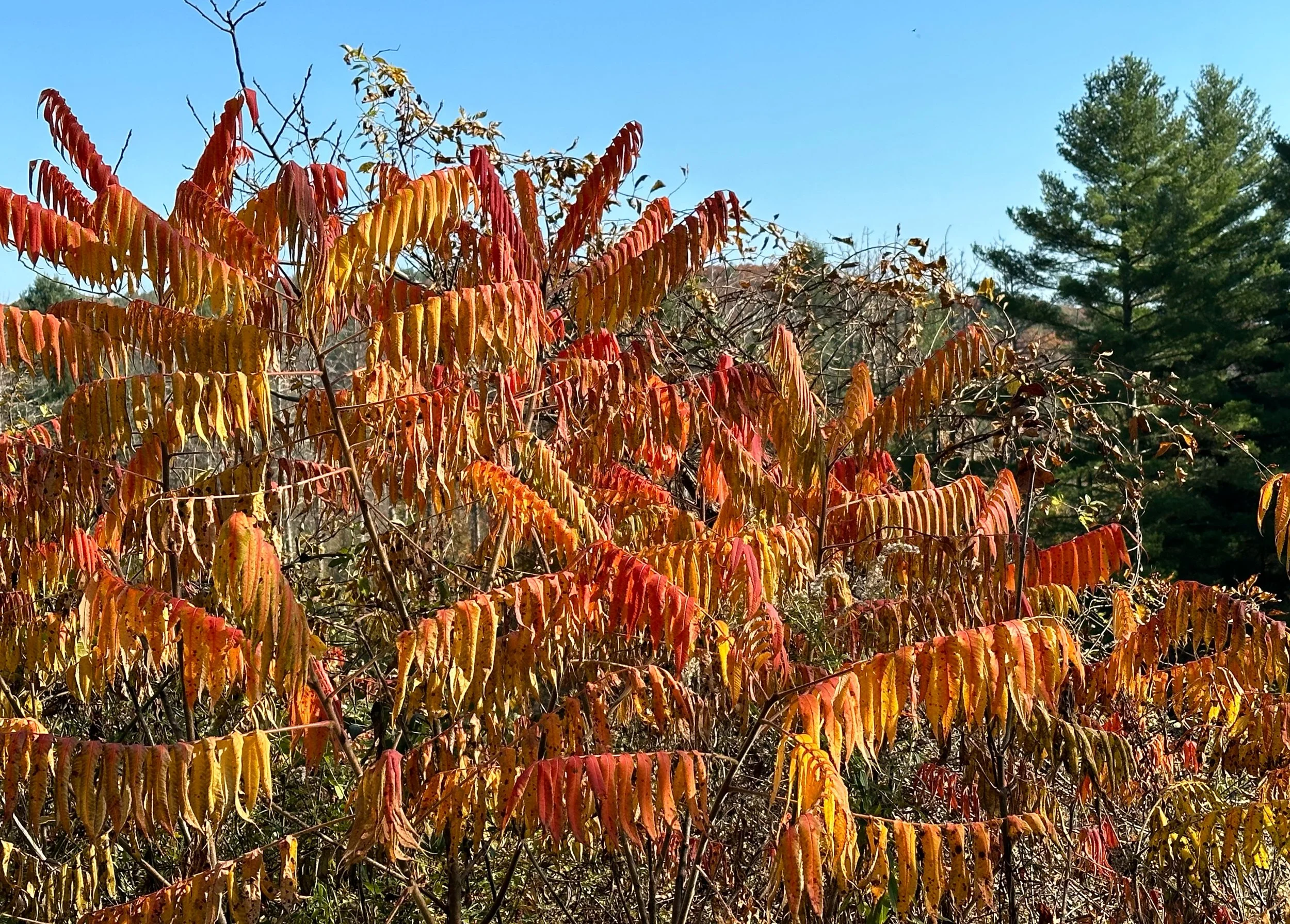 Another native woody plant but closer to a large shrub and rarely used in cultivated landscapes is the rather disheveled, ratty looking Staghorn Sumac. Redeeming it are its elongated drooping leaves that make for one of the hottest colors in the fall palette. Many varieties exist. However, the “staghorn” is thus named for its large protruding flower resembling, yes, a stag horn. (Sorry no photo here.) However, you would recognize its large, striking crimson, velvety flowers with dense clusters of red berries that emerge in late summer. When dried, they offer medicinal and culinary properties including exotic spices used as far as the Middle East for hummus.